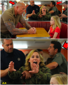 But the silence did not extend to the red booth. Lily, witnessing the raw display of cruelty and power imbalance, gripped her father’s massive, tattooed forearm. Her eyes, wide with a mixture of fear and moral certainty, looked up at him.