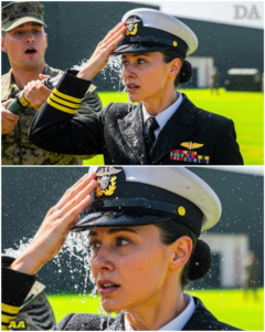 Admiral Vance simply smiled faintly, a serene, almost unnerving expression, water dripping from her face. She calmly reached down, retrieved her soaked officer cap, and placed it back on her head, its gold braid—the sign of a Flag Officer—shining despite the water.