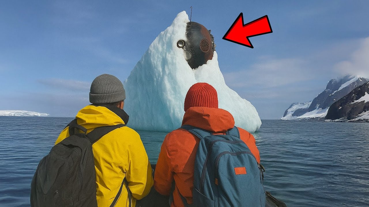 Against the blinding white of the ice, a dark metallic shape jutted from the side of an iceberg, half-encased in blue glacial ice.