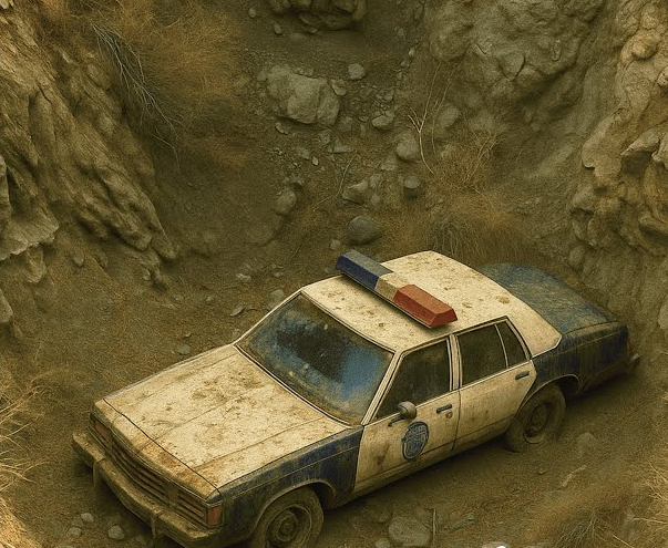 Fast forward to 1999. Two hikers exploring a remote canyon more than 40 miles from town stumbled upon something strange wedged between overgrown brush and rusting rock — a police patrol car, long abandoned and nearly swallowed by nature.