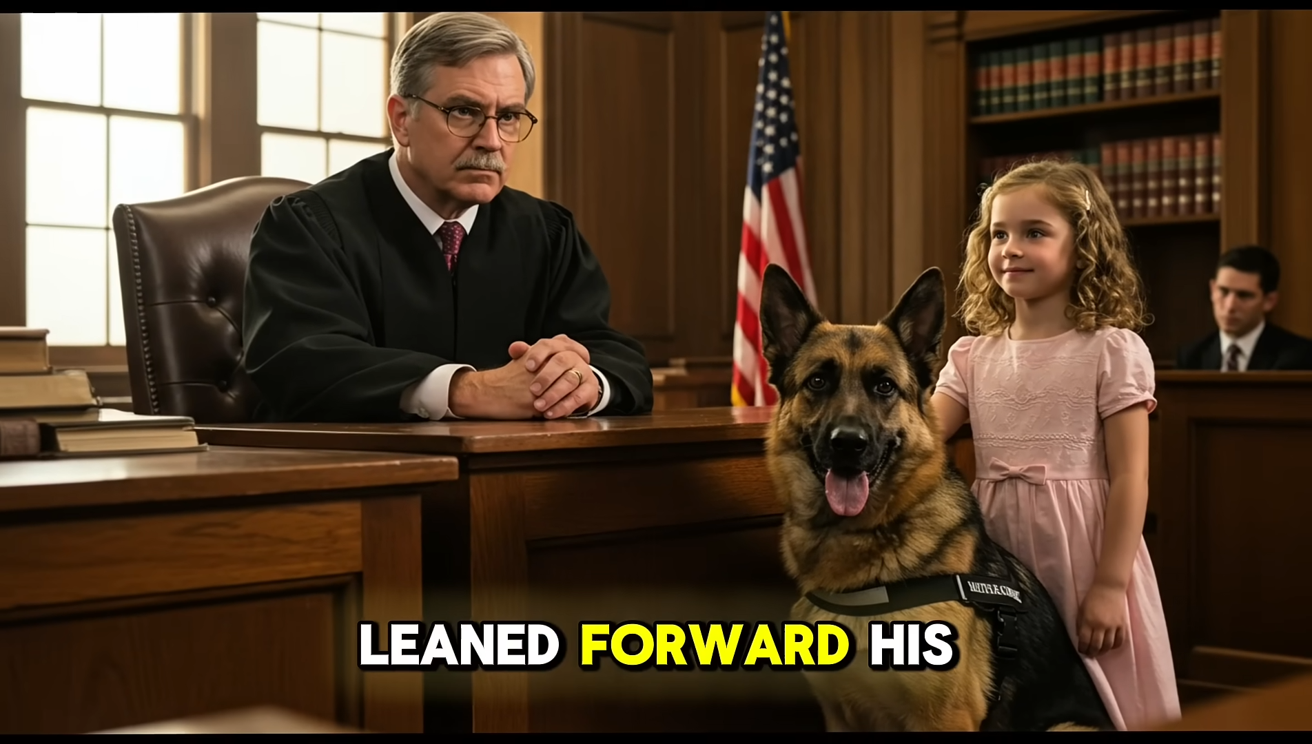 This courtroom scene is reminiscent of countless real-life hero moments where animals have played a crucial role in protecting and supporting their human companions.
