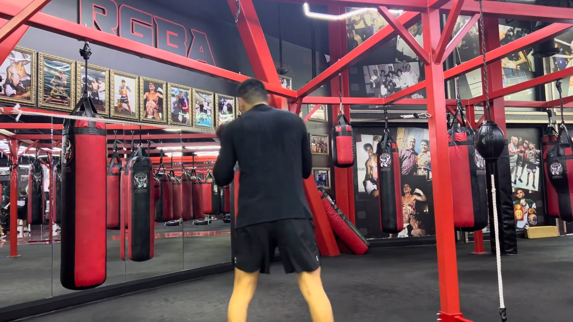 His training sessions typically include sparring, bag work, and strength training.
