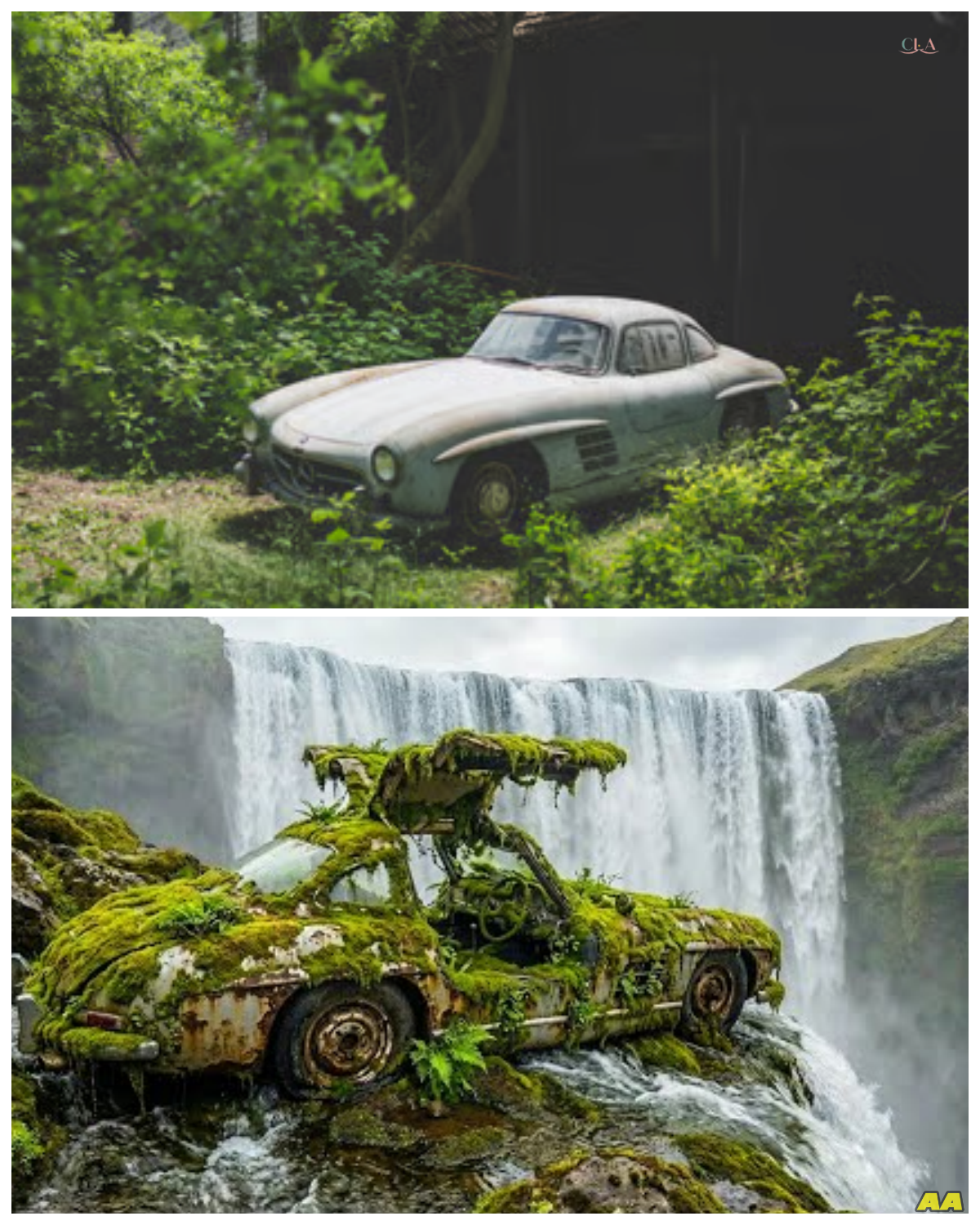 In the heart of a secluded forest, nestled beneath the cascading waters of a hidden waterfall, lay a relic of automotive history.