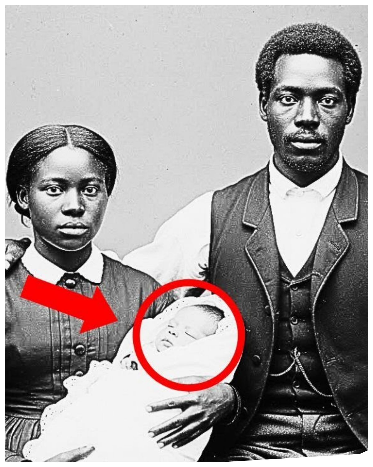 A black woman seated in the center, a black man standing beside her with his hand on her shoulder and what appeared to be an infant wrapped in white cloth and lace, cradled protectively in the woman’s arms.