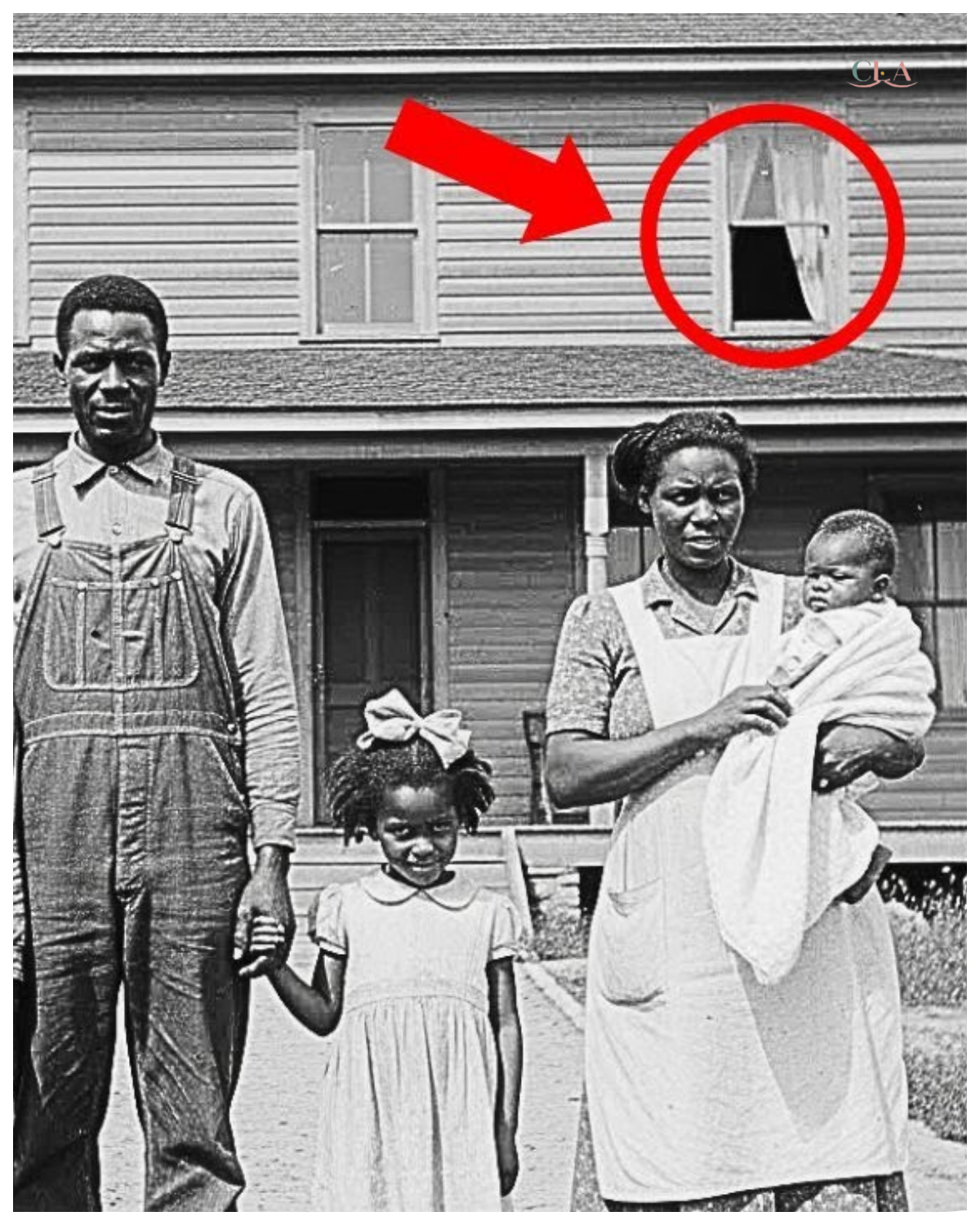 The photograph showed a black family of five standing in front of a modest two-story wooden house.