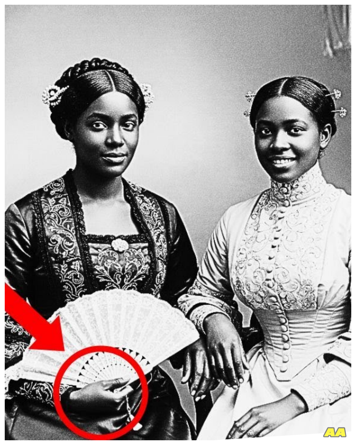 Both women were strikingly beautiful, their hair styled in the fashionable, upswept manner of the early 1890s, adorned with small decorative combs.