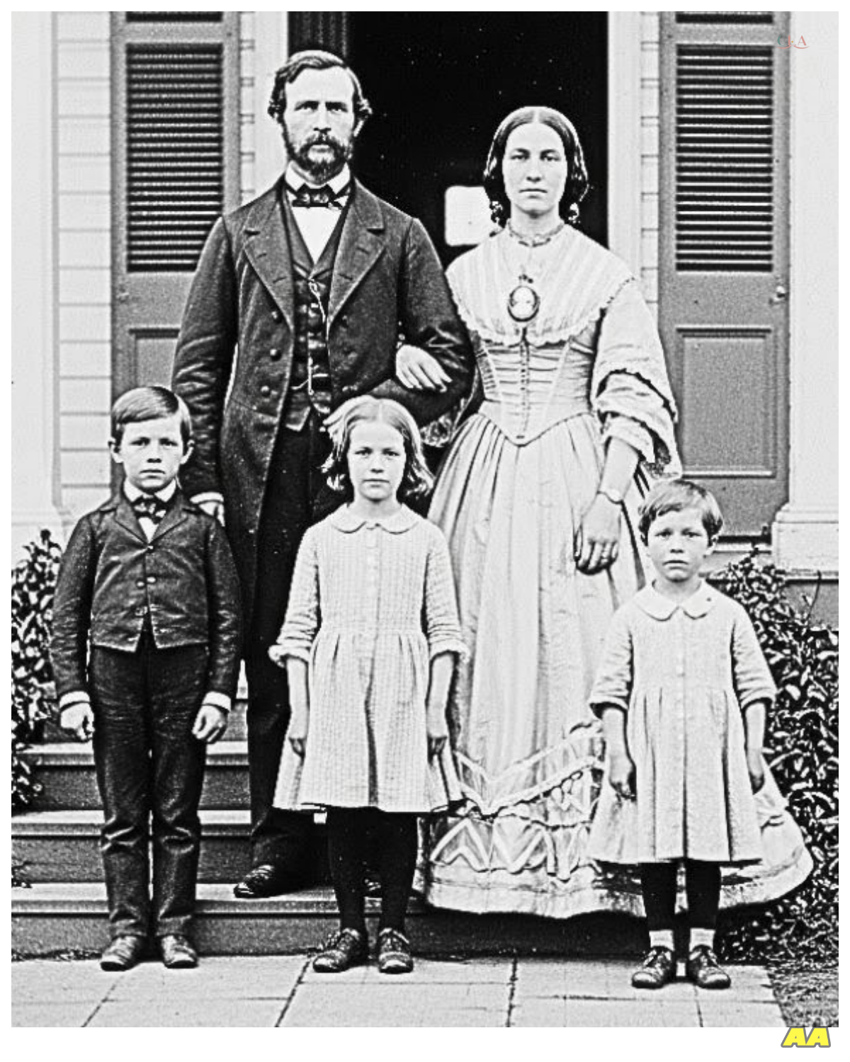 A man in a dark suit, a woman in an elaborate dress with a cameo brooch, and three children arranged in descending height order, standard for the era, unremarkable except for its age and fragile condition.