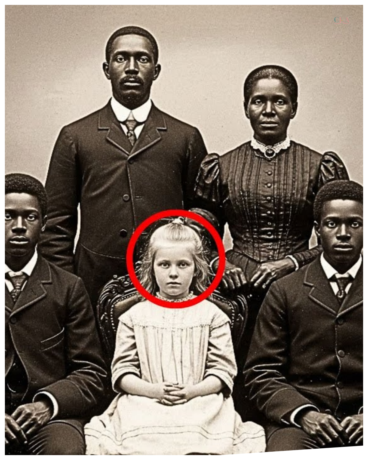 The child’s skin tone, now clearly visible in the restored image, was distinctly lighter than the four adults surrounding her, significantly lighter.