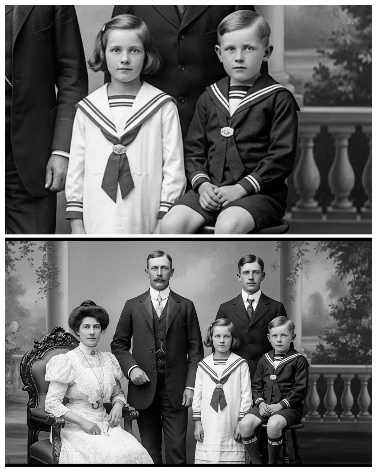This 1904 Family Photo Is Calm — Until the Child’s Face Reveals Something Odd The photograph arrived at the Smithsonian’s National Museum of American History on a humid Tuesday morning in September 2024. Dr.Margaret Chen, a curator specializing in early American photography, carefully lifted it from its protective envelope. The image appeared unremarkable at first glance. A formal family portrait from 1904, showing a well-dressed couple standing behind three children arranged on an ornate Victorian sofa. The family’s clothing spoke of modest prosperity. The father wore a dark wool suit with a high collar. His mustache meticulously waxed in the fashion of the era. The mother’s dress featured the characteristic puffed sleeves and high neckline typical of Edwwardian women’s fashion. Two of the children, an older boy and a girl, sat perfectly still, their expressions serious, as was customary for photographs of that time. Another donation from the Hartwell estate.