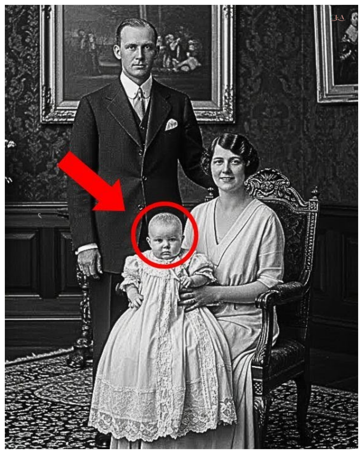 The infant, perhaps six or eight months old, sat on the mother’s lap, wearing a long white christing gown that cascaded over the mother’s knees.
