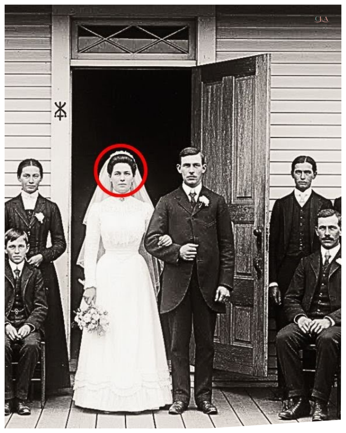Someone had carved it there intentionally, and the photographer had positioned the wedding party in such a way that the open door was visible in the frame.