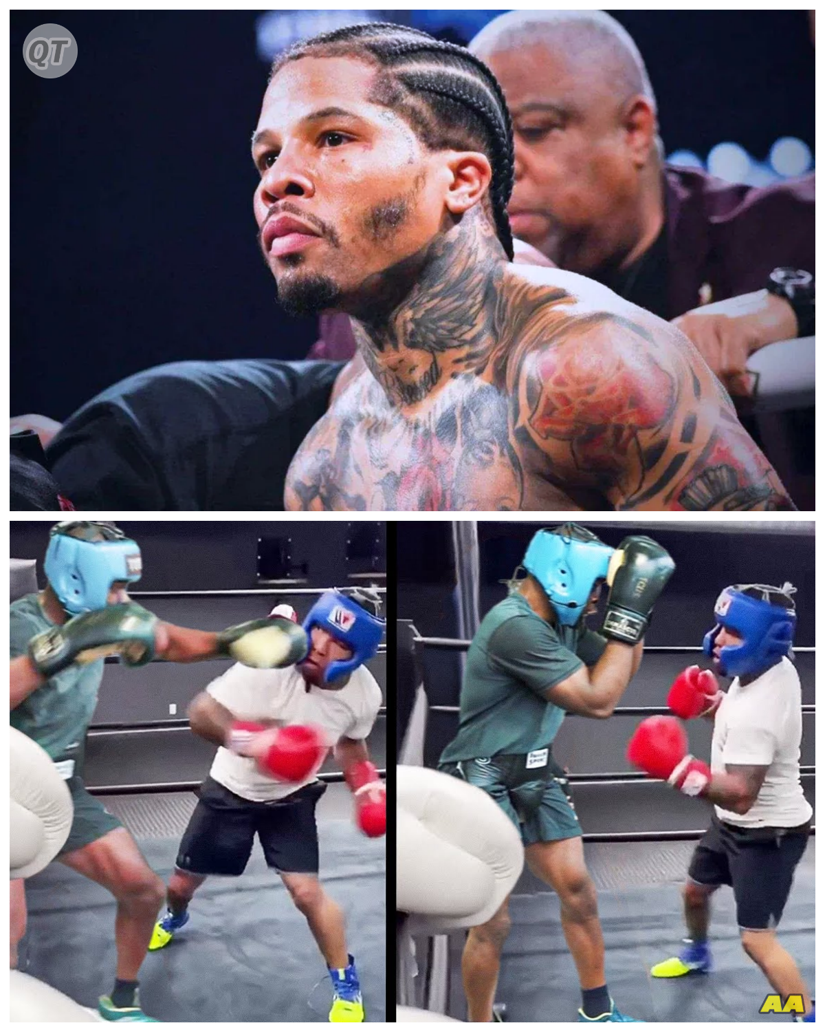 As the sparring session comes to an end, Davis stands in the center of the ring, breathing heavily, sweat dripping from his brow.